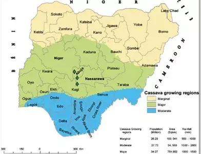 Kogi State secures the third position among Nigeria's cassava producing states through suitable conditions, strategic location at the confluence of Niger and Benue rivers, and good market access to both northern and southern Nigeria. The state accounts for approximately 8% of national cassava production, producing over 4.5 million metric tons annually.